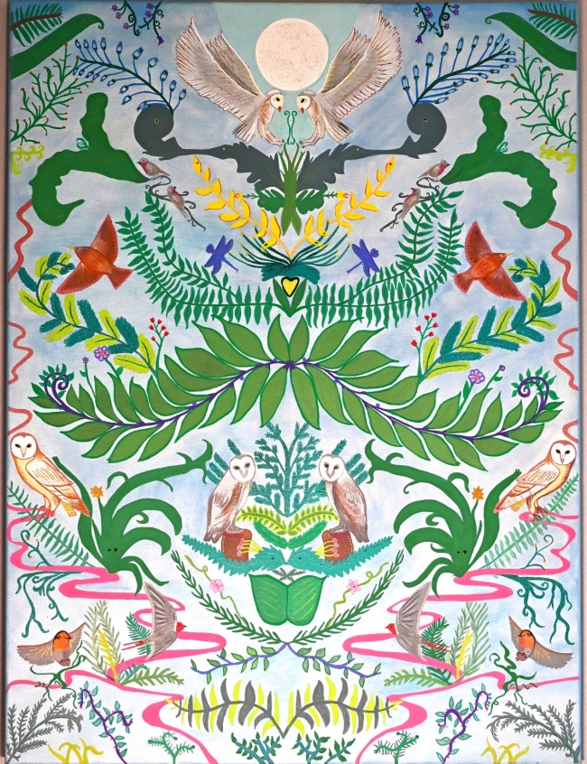 Au centre, une structure végétale rayonnante se déploie comme un arbre de vie, entourée d’une profusion de feuillages, fougères et formes botaniques qui s’entrelacent. Plusieurs oiseaux apparaissent à différents niveaux de la toile, notamment des chouettes et des oiseaux en vol, symbolisant la sagesse, la protection et la liberté.