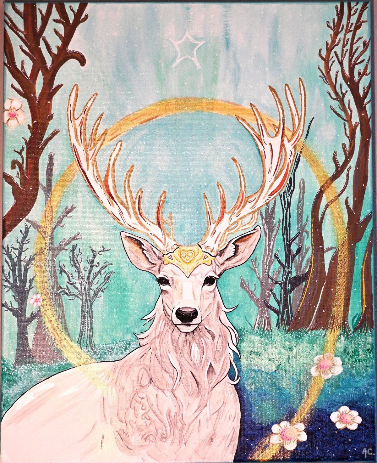 Réalisée à l’acrylique avec des effets de paillettes dorées, cette peinture vibratoire invite à l’écoute intérieure, à la connexion à la nature profonde et à l’ouverture aux mondes invisibles.