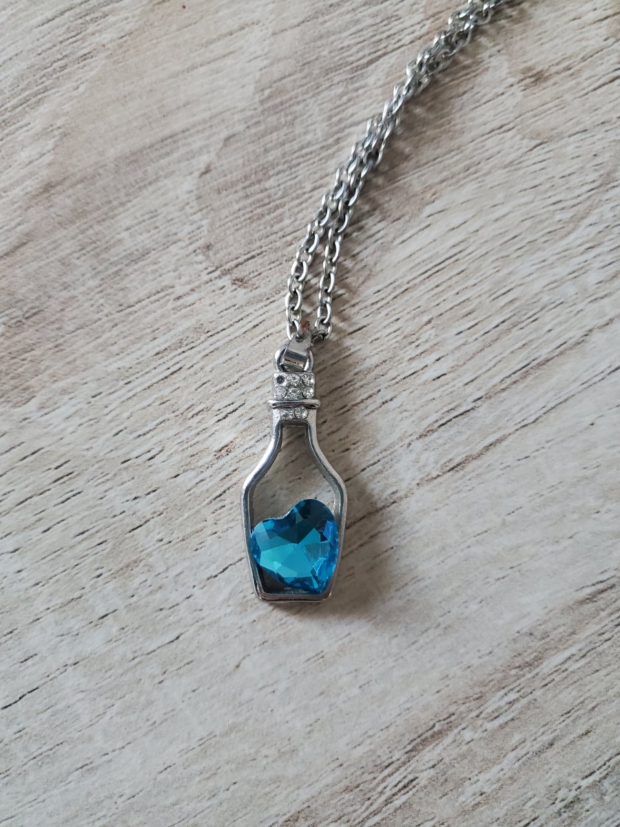 Ce bijou unique représente une petite bouteille renfermant un cœur bleu brillant, capturant la lumière pour créer un effet délicat et captivant.