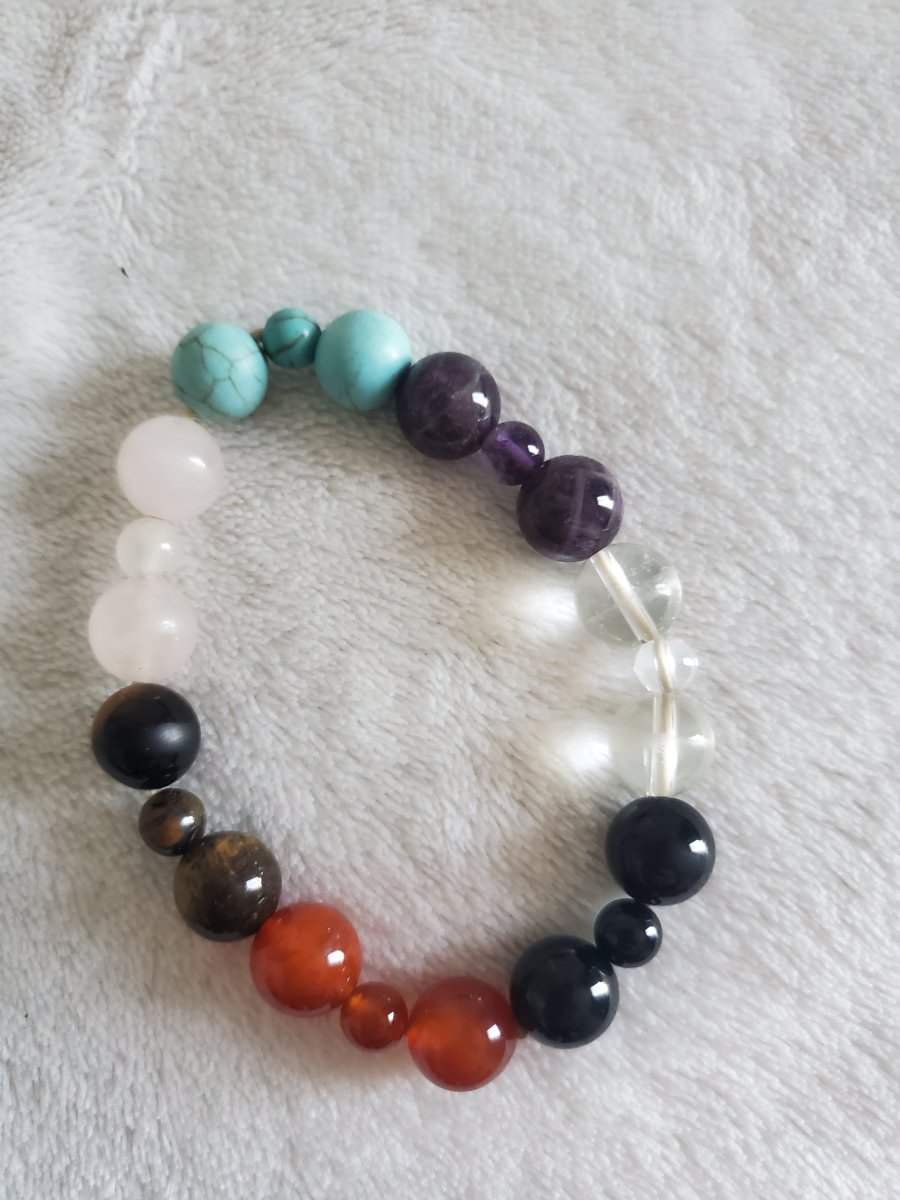 Ce bracelet favorise l’équilibre énergétique, l’harmonie émotionnelle et la circulation fluide des énergies dans le corps. Chaque pierre a été sélectionnée pour sa vibration spécifique et complémentaire, créant un bijou à la fois esthétique et porteur de sens.