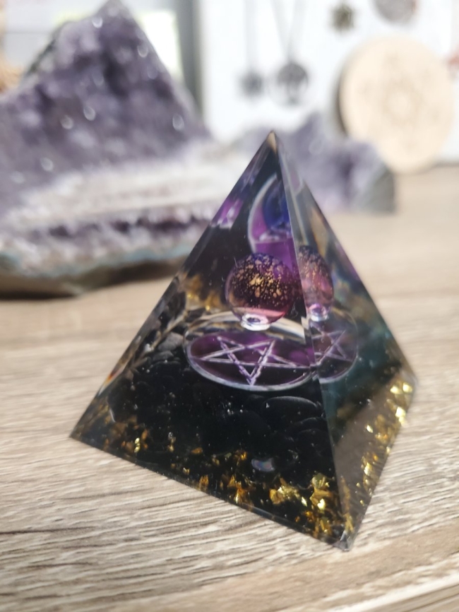 Le pentacle renforce l’intention de protection et de stabilité énergétique, favorisant un alignement entre le corps, l’esprit et l’environnement. L’orgonite agit comme un support de transformation et d’harmonisation des énergies environnantes.