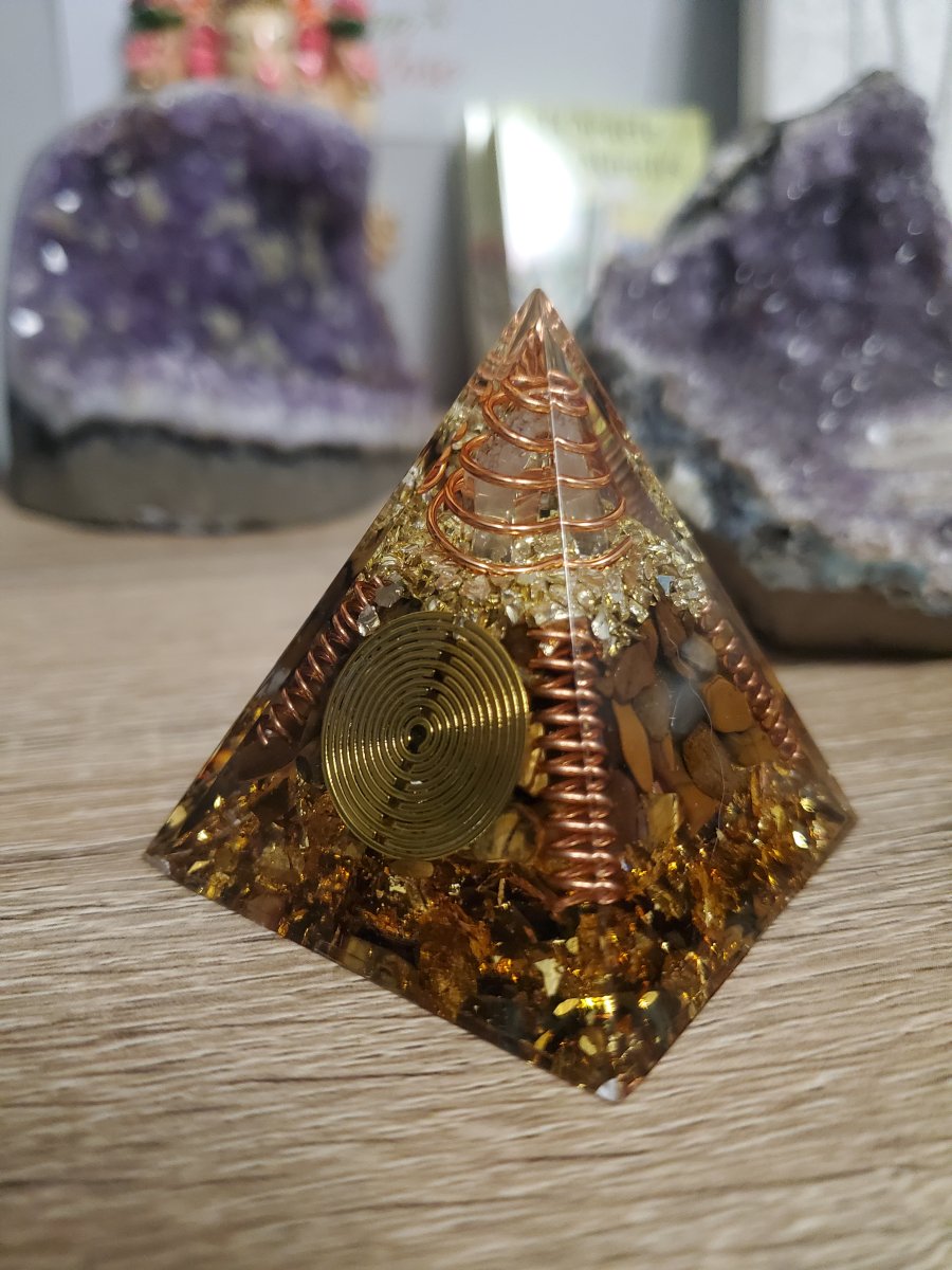 Cette orgonite associe l’Œil de Tigre et le cuivre, créant une synergie favorisant la protection, la vitalité et l’ancrage. L’Œil de Tigre est traditionnellement reconnu pour renforcer la confiance en soi, la stabilité émotionnelle et la protection énergétique.