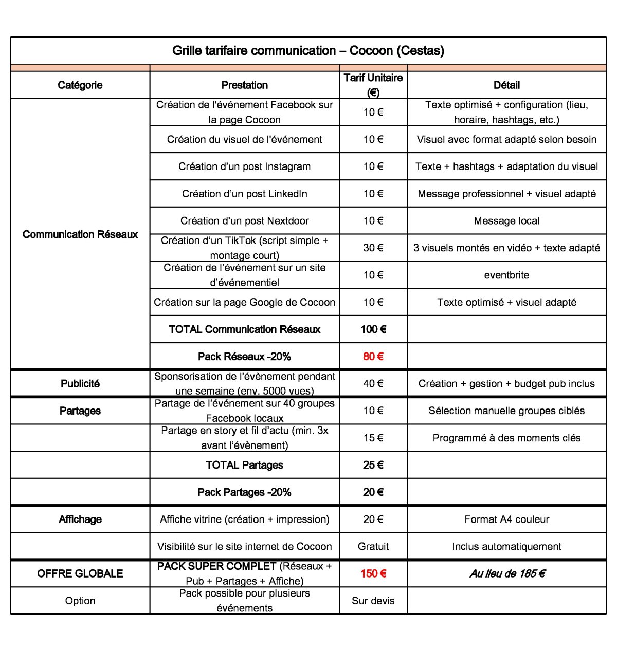 Communication de Cocoon _ TARIFS